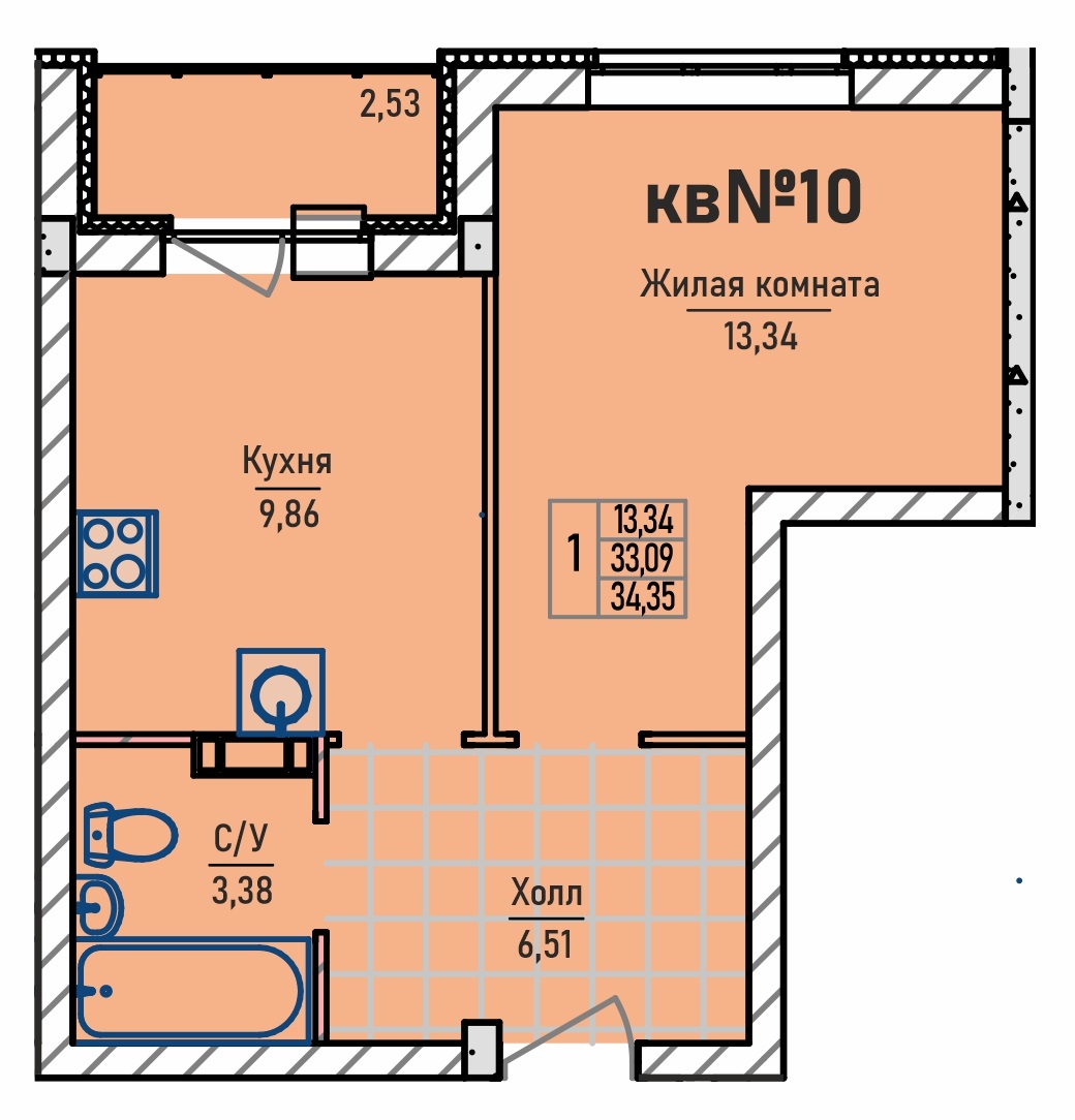 1-комнатная квартира 34,35 м2
